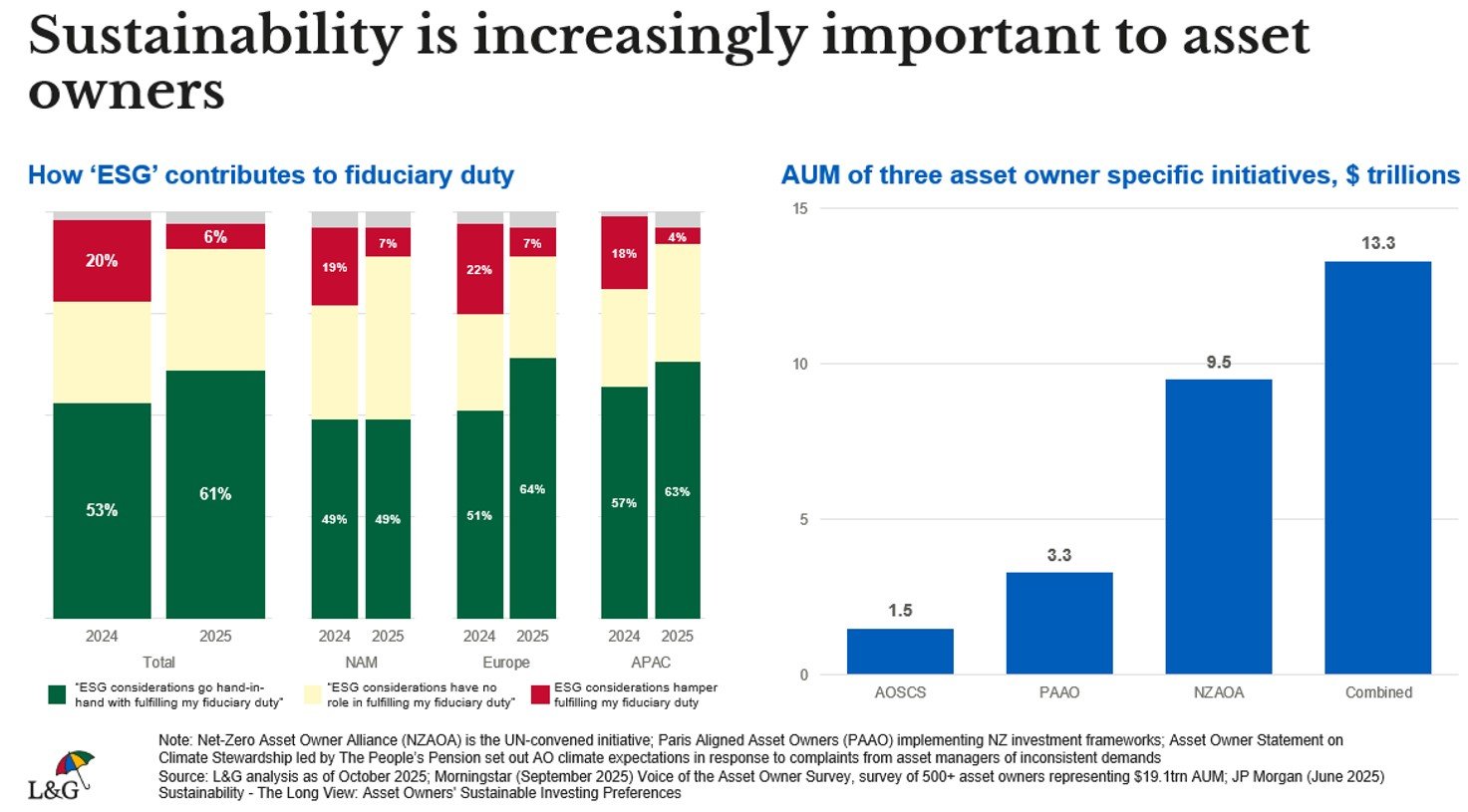 But look a little deeper and a different narrative is emerging. Asset owners – public pensions and sovereign wealth funds who tend to think far longer term than the typical quarterly view – are ramping up pressure to stay on track for their climate ambitions. 61% of asset owners believe sustainability goes hand in hand with their fiduciary duty (up 8ppts from last year); about the same believe materiality of such topics has increased in the last 5 years.[1] Many see themselves as “universal owners”: investors whose portfolios are so large and diversified that their fortunes are tied to the long-term health of the entire economy. For them, sustainability is often a necessity.