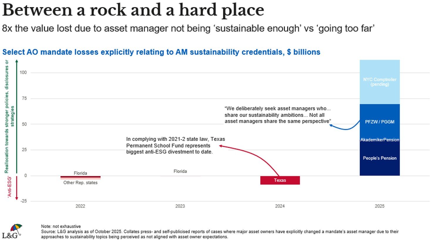 Asset owners are also reallocating mandates to managers who take sustainability seriously. An estimated $7.3 – 11.7 trillion of externally managed funds are covered by sustainable investing policies.[4] The People’s Pension recently led a $1.5 trillion coalition to publish an Asset Owner Statement on Climate Stewardship, warning that poor stewardship could lead to mandate reassessment.[5] This signals a clear expectation for asset managers and portfolio companies to align with asset owners’ sustainability objectives. In fact, more than eight times the mandates have been lost by asset managers for not being ‘sustainable enough’ compared to ‘going too far’ since 2022.