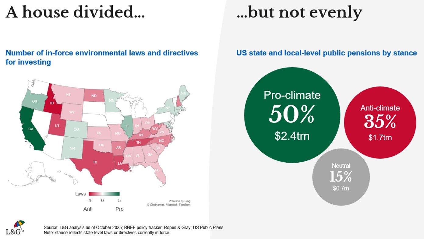 Yet even in the US, the picture is more nuanced. Around 50% of public pension assets – some $2.4 trillion – are in states that remain pro-climate, actively supporting climate-aligned investment strategies. Only about a third of assets are in states with anti-climate policies. Even there, implementation can be patchy and costly. Texas’s bank boycott laws, for example, are estimated to have cost ~$670 million in lost economic activity in 2022-23 due to tightening the municipal bond market.