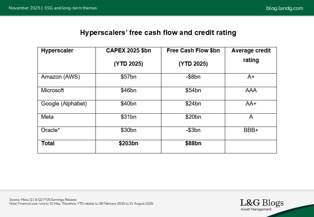 Despite the staggering scale of investment required to support AI infrastructure, the largest hyperscalers appear well-positioned to manage the financial burden in the short term. Strong free cash flow, benefitted by tax incentives, strong credit ratings, and diversified financing strategies (including private credit and securitisation) give these firms the flexibility to scale rapidly, in our view. While risks like overcapacity and tech obsolescence remain, the current financial and policy environment suggests that is possible that the aggressive hyperscaler expansion may also be financially sustainable, at least for the Big Tech players.