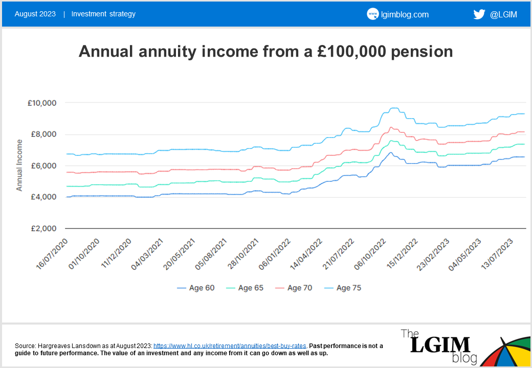 Demand for annuities is likely to stick around in the face of an uncertain future (higher inflation may also push up demand for inflation-linked annuities; a fairly niche corner of the market), as retirees get much more bang for their buck at current rates, and if they delay retirement as observed over the last few years.