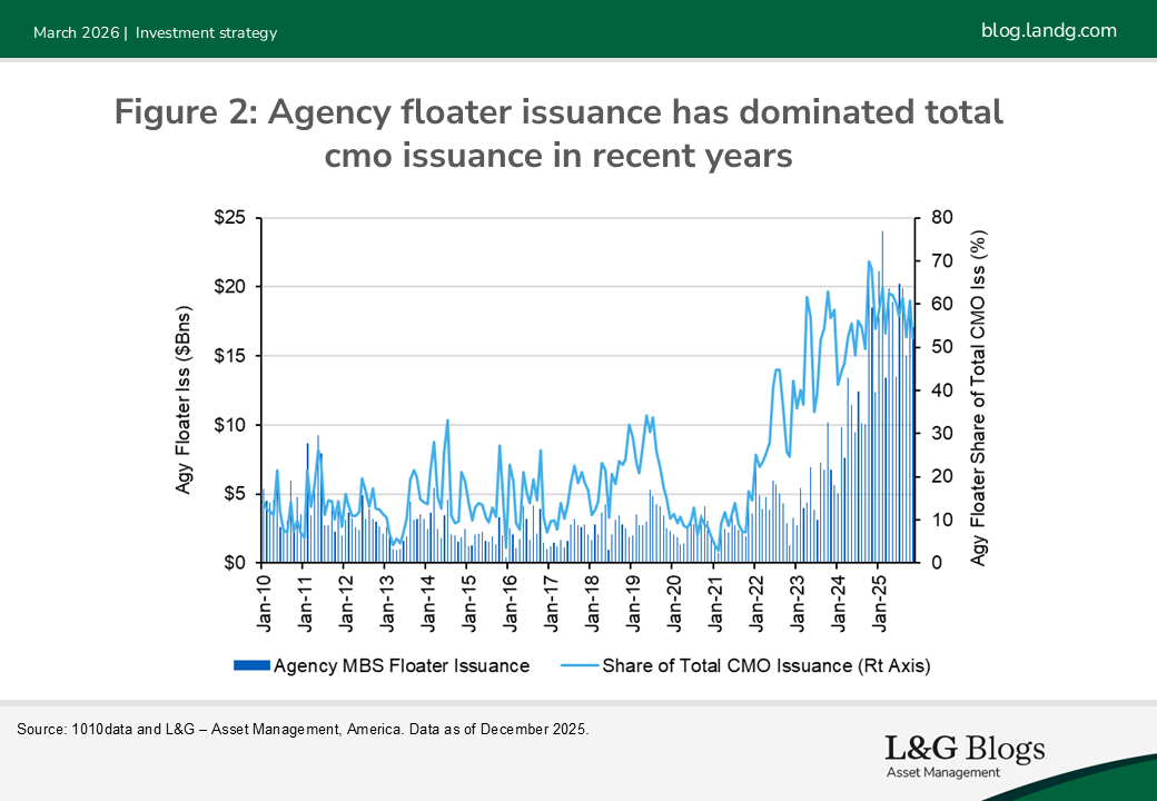 As mentioned above, agency floaters do not have credit risk. But they tend to be structurally and analytically more complex than other floating-rate alternatives such as collateralized loan obligations (CLOs), non-agency residential mortgage-backed security (RMBS) floaters and asset-backed security (ABS) floaters. A key distinguishing feature is that agency floaters are capped, while CLOs and most ABS floaters are not. For example, a bond might pay “SOFR + 1.5% with a cap of 6%.” If SOFR rises to 4%, the bond pays 5.5% (4%+1.5%). But if SOFR goes to 4.5%, the coupon gets capped out at 6%. Furthermore, agency floaters carry prepayment risk. Therefore, investors need to consider the structure of the underlying fixed-rate bond as well as the collateral characteristics.