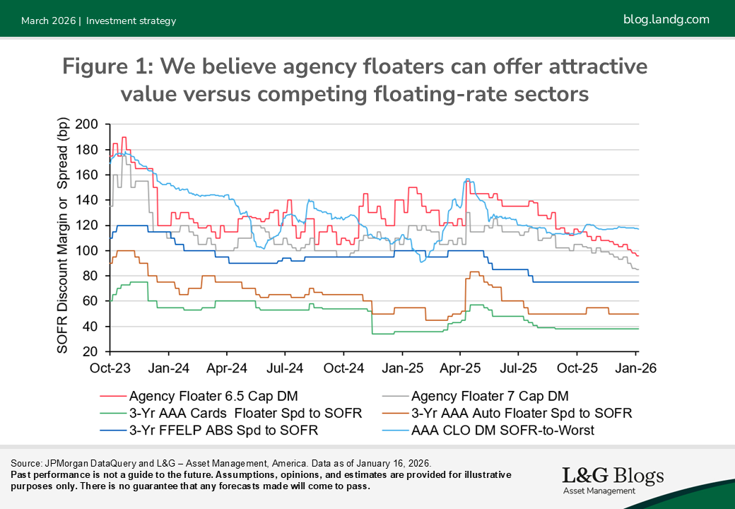 Figure 1 shows agency floater discount margins along with spreads on a variety of competing sectors. With the caveat that spreads across sectors are not directly comparable because of structural differences, the chart illustrates that agency floater spreads have generally been compelling versus competing sectors over the past couple of years.