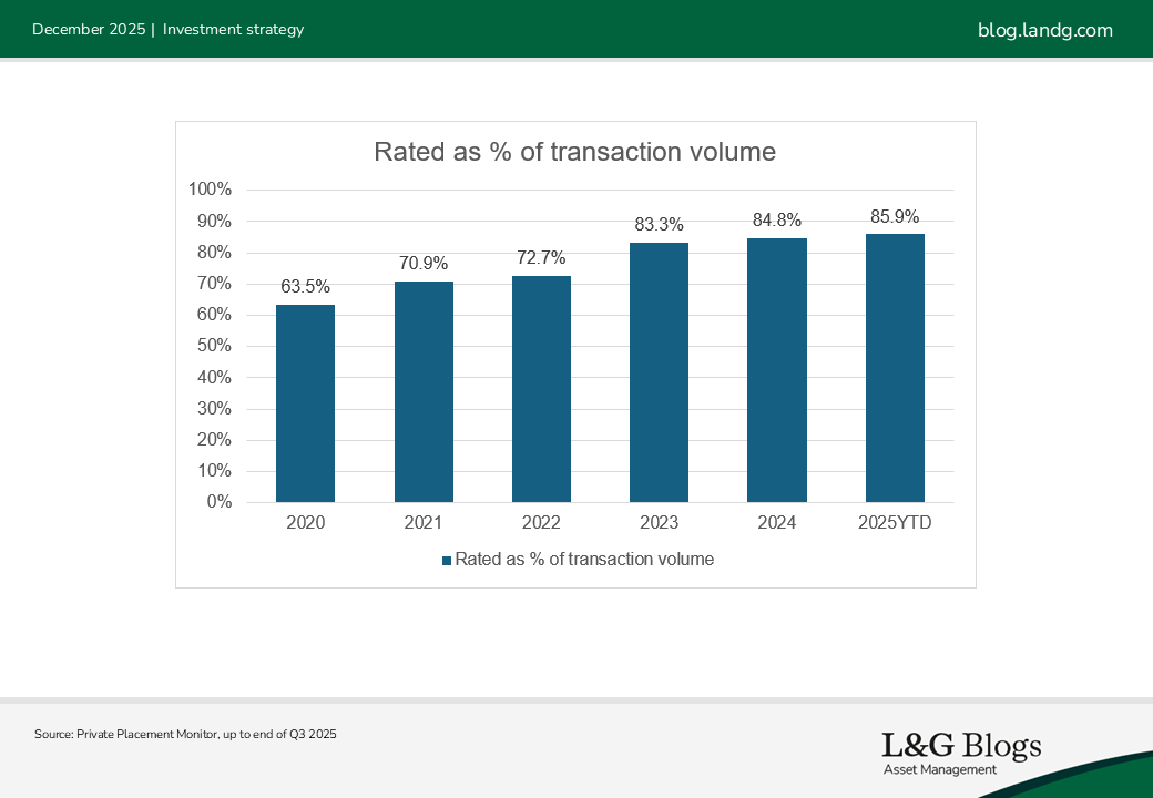 Insurers are a big investor in IG private credit due to the high credit quality and liability-matching characteristics. They also commonly require formal credit ratings for capital requirement purposes. This can be sourced from an external credit rating agency (referred to as an ECAI[1] in Europe and NRSRO in the US) or from an internal ratings team. In 2024, c.85% of US private placements volume, which is a large part of the IG private credit market, had at least one external credit rating. Where the borrower has also issued debt in the public market, which is more common for IG than sub-IG, there will typically be a public credit rating available for the borrowing entity.