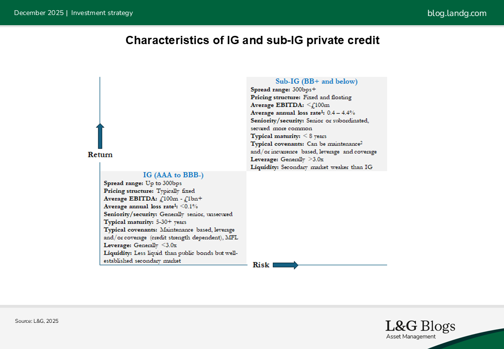 When people use the term ‘private credit’, they often mean the sub-investment grade (sub-IG) part of the market, which is dominated by direct lending. This segment grew rapidly in the aftermath of the global financial crisis. Investment-grade (IG) private credit, in comparison, is less spoken about. We have previously written extensively about this asset class which has a track record over several decades. In terms of market size IG and sub-IG private credit are roughly the same at around $1.5tn-$2tn each based on our estimates.