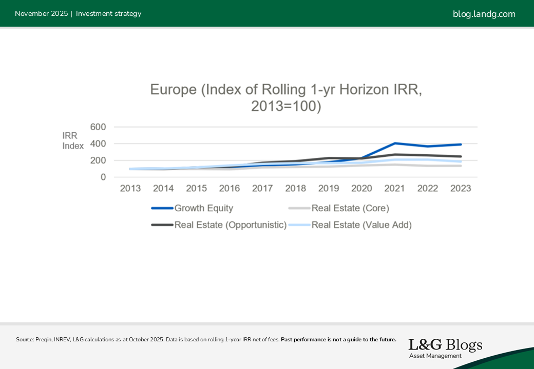 Preqin data for Europe covering the 10-year period to end-2023 confirm a relatively low correlation between overall growth equity returns to those of core real estate (0.43) as well as a significantly higher return, averaging 15%. In contrast, opportunistic real estate delivered a lower return and showed a higher correlation with the real estate cycle.
