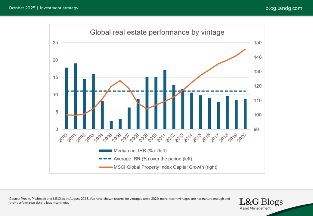 The main driver was entry pricing – real estate and private equity valuations fell significantly during the GFC. Funds that invested in the down years were subsequently rewarded as the market went on a long bull run from 2010.