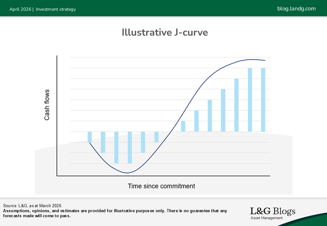 In private markets, capital is drawn down slowly, some of the fees and expenses are front‑loaded, deals take time to close, and underlying assets may be held at cost before valuations start to move. As a result, capital deployment is often slow and the performance profile typically dips before rising as projects mature and begin to distribute income or generate realised gains.
