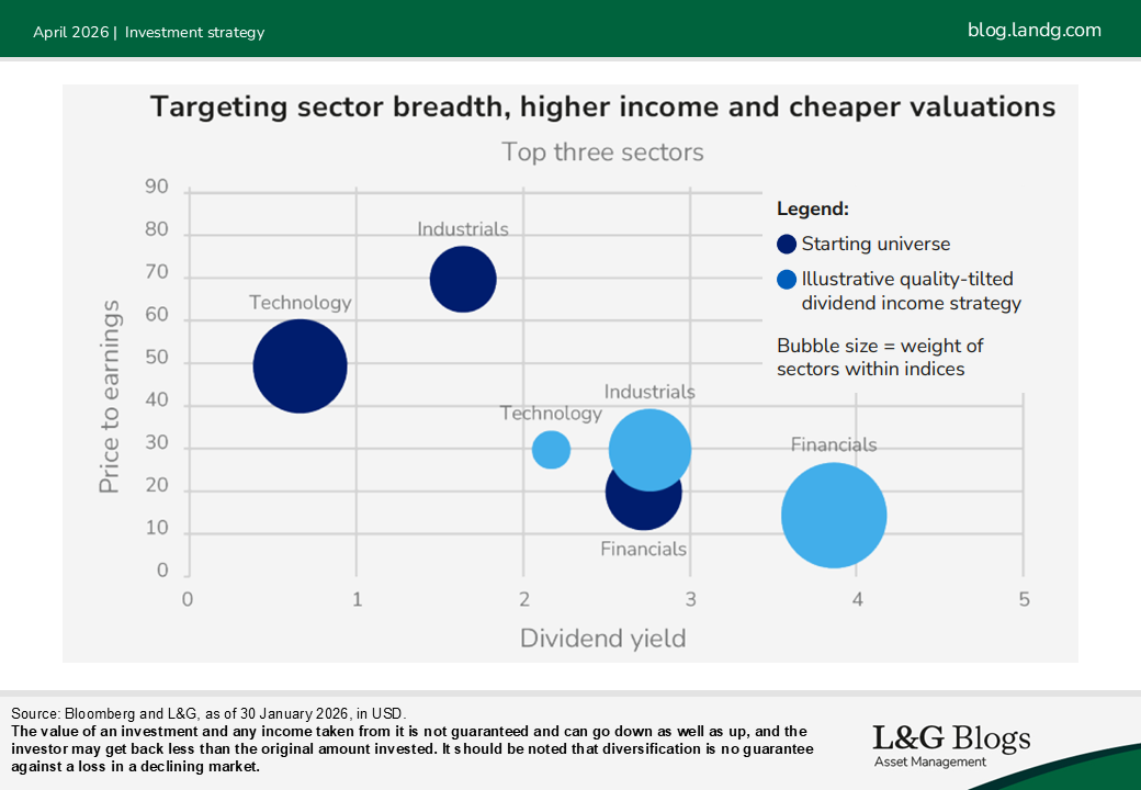 1. Wider sector breadth: The bubble sizes represent the weight of sectors within the indices. The illustrative quality-tilted dividend income strategy displays lower exposure to IT, and higher exposure to financials and industrials