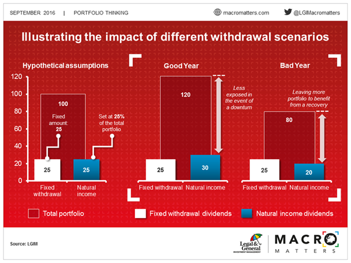 If you invest right before the market downturn and keep withdrawing a fixed amount every year, as your investment pot shrinks with negative market returns you may run the risk of drawing down your entire portfolio, giving up any chance of recovery when the market turns. If you opt for natural income distributions you will effectively collect lower distributions on the way down, protecting the size of your pot, and you could be rewarded with higher distributions when the market rallies, effectively participating in the recovery.