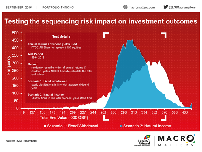 This is because the natural income essentially acts like a buffer. In weak markets, it limits the withdrawals to keep the pot large enough to benefit from the future recovery. In strong markets, it increases the withdrawals, lowering the amount of money left in the portfolio that may be exposed to subsequent downturns. Hence, the sensitivity to the sequence of returns is lower, providing more certainty around the end value of the investment.