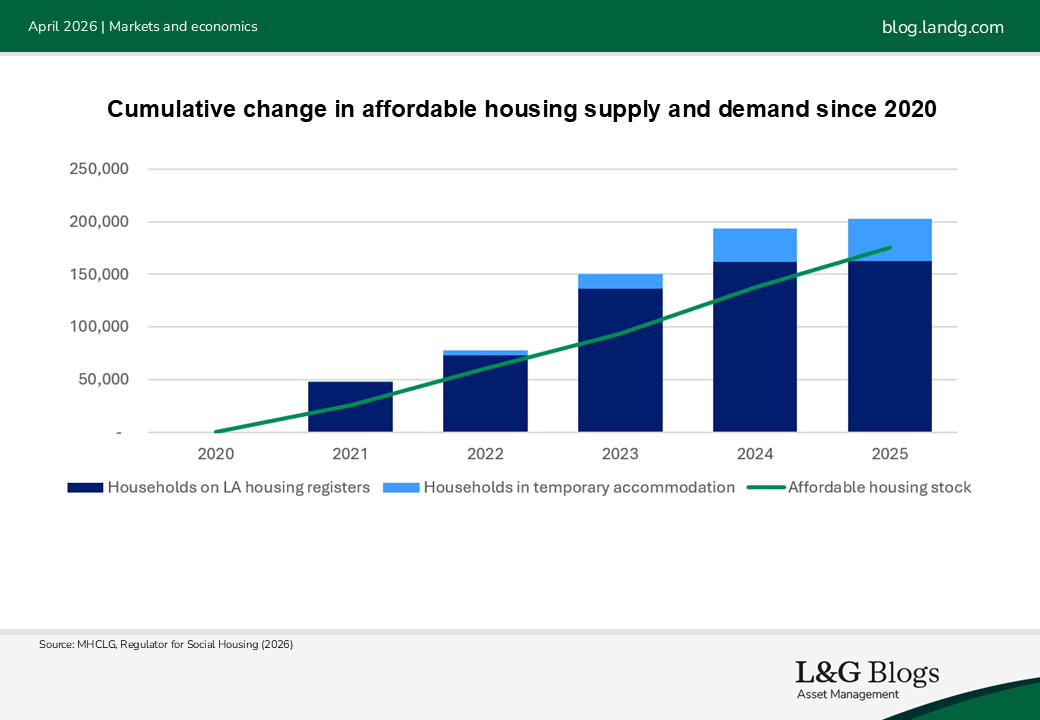 A weakening in housebuilding comes at a time when the under-supply of Affordable Housing is particularly acute. As of 2025, the number of households on Local Authority housing registers (i.e., waiting lists) was at its highest level since 2014. Households in temporary accommodation have also reached record highs. In short, the need for Affordable Housing is outpacing delivery.