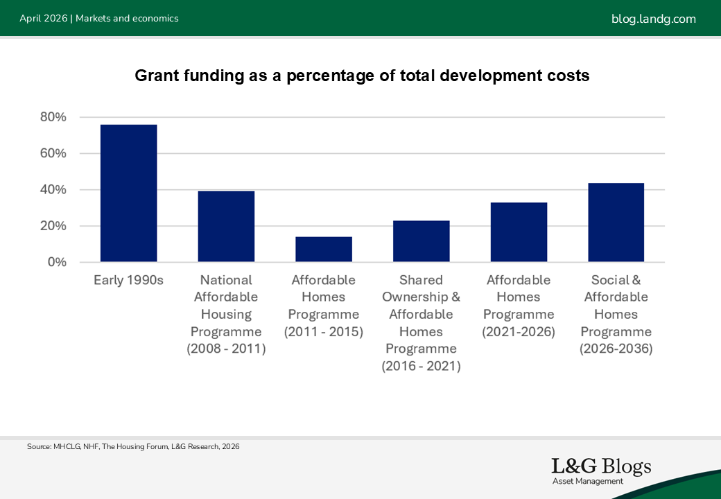 The launch of the UK Government’s Social and Affordable Homes Programme (SAHP) in April 2026, combined with the 10-year Affordable rent settlement announced in 2025[5] does, however, provide scope for renewed optimism for UK housebuilding. The SAHP, which provides £39 billion of funding targeting 300,000 new homes over a 10-year period, represents a material uplift in the funding environment, with the launch of the UK’s National Housing Bank in March providing added firepower. We believe this represents the healthiest grant environment since pre-2008[6].