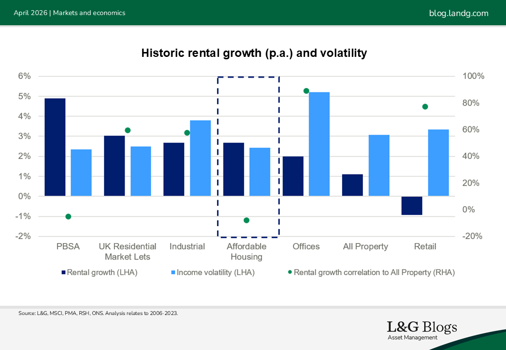 From an investment returns viewpoint, our view is that Affordable Housing may offer comparatively stable, inflation-linked returns alongside positive social impact. A resurgence in volatility and inflation expectations over recent times only serves to highlight the potential attractiveness of defensive, asset-backed cashflows with embedded inflation linkage. In addition, rental growth historically delivered by the Affordable Housing sector has been less volatile than the All Property average and has been negatively correlated to it, highlighting the inherent diversification benefits provided by the sector.