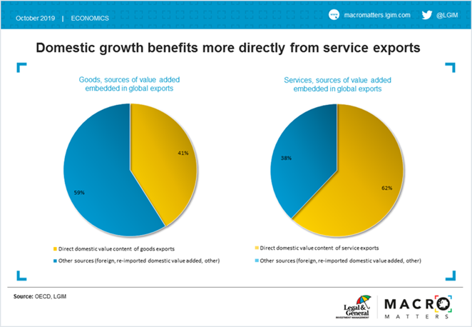 This analysis shows that efforts to rein in globalisation are likely to be damaging to both emerging and developed markets. Emerging markets are set to suffer from weaker goods exports; developed markets are likely to suffer from weaker services exports. Goods are the target of tariffs, but non-tariff barriers rooted in regulatory differences are the biggest threat to services. The economic costs, and therefore market implications, of a breakdown in global trade flows are understated by those who only consider the goods side of the story.