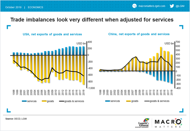 First, when we include services, trade balances look very different. The US trade deficit looks smaller (just above $600 billion in 2018, as opposed to oft-quoted $850 billion) and the Chinese trade surplus shrinks to barely $100 billion (from above $400 billion in goods only). The perception of China as the world’s generator of surpluses is thus slightly misguided – and looks even less persuasive when looking at the current account balance, economists’ preferred measure of external balances. So it is far from clear that the renminbi is undervalued or manipulated, as President Trump claims.