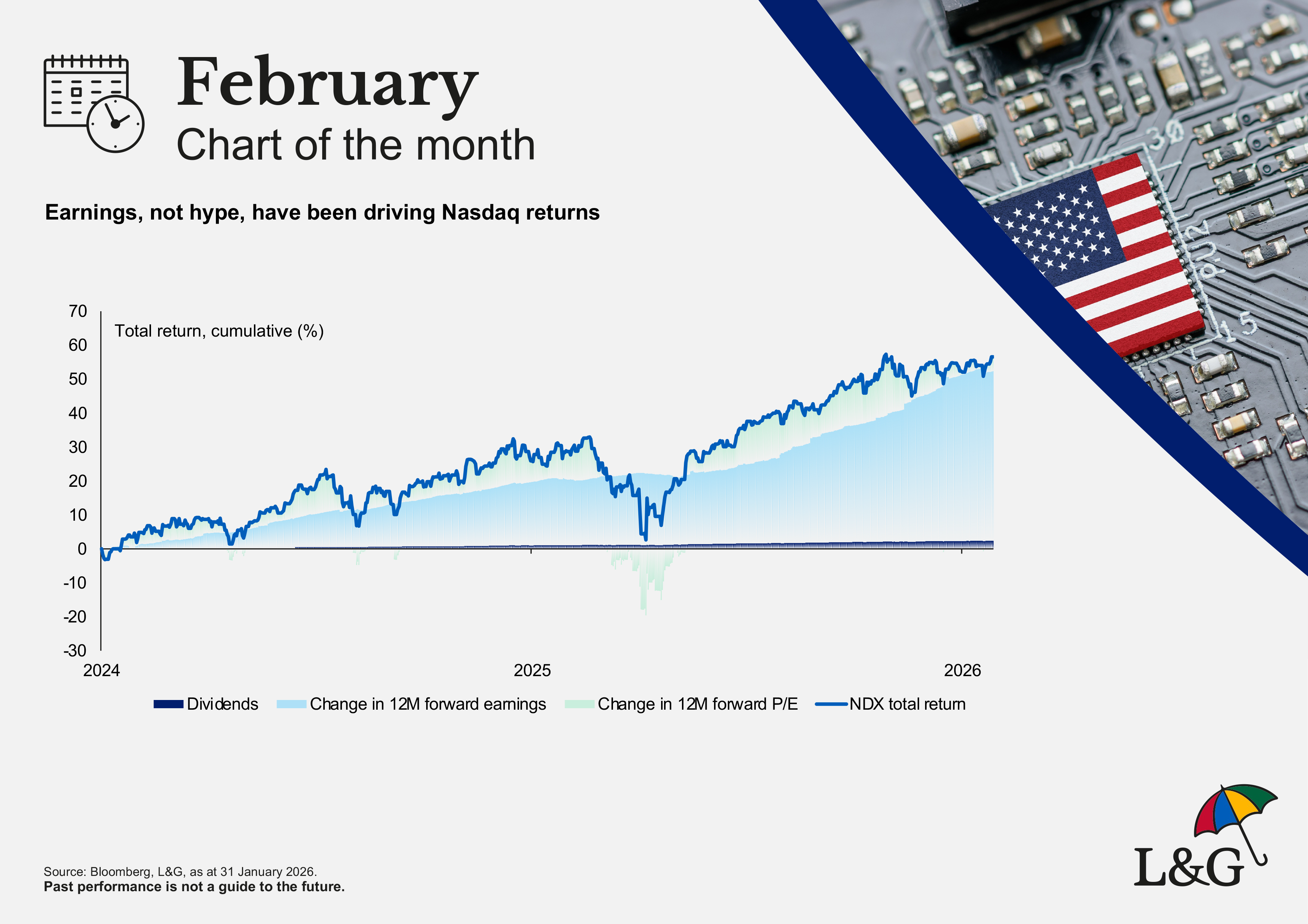 While price-to-earnings multiples across the index are indeed high relative to history, our chart of the month highlights how it is actually earnings delivery – not hype – that has delivered returns to investors over the past two years.