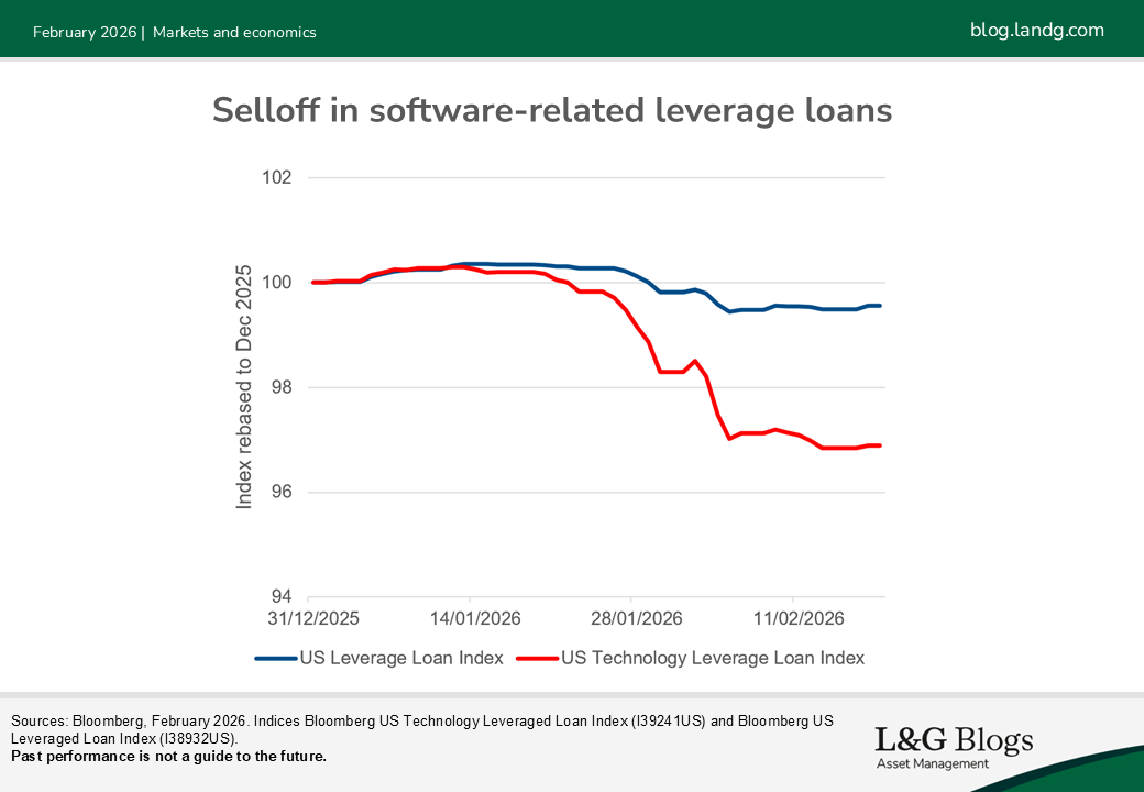 Software and software as-a-service (SaaS) leveraged loans have also fallen this year so far amid selling by CLO managers and loan funds reacting to the tech turmoil. Year-to-date (mid-February), US and European technology loans (which include software) are down roughly 3% versus a flat broader loan index. 11% of technology loans within the Bloomberg US Leveraged Loan Index are now classified as distressed based on trading levels, up from approximately 6% at year end[2].