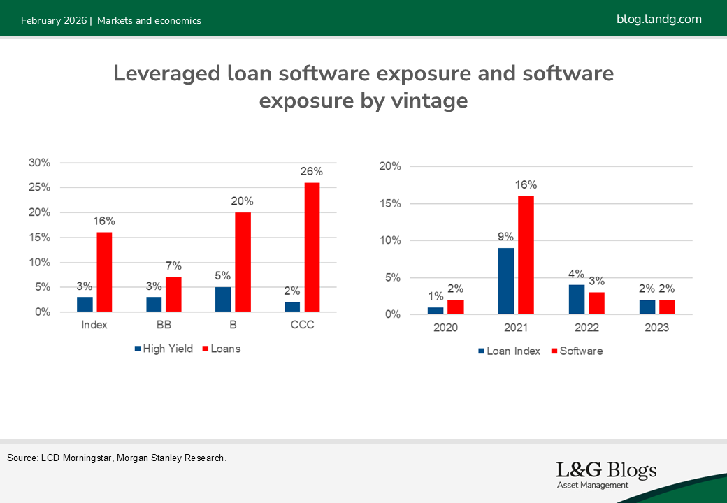 Concerns around software loans are not totally without justification, in our view. Loan market software exposure is skewed towards lower-rated single B and CCC rated loans and is concentrated in the 2021 vintage, with roughly 16% of loans originated in 2021.