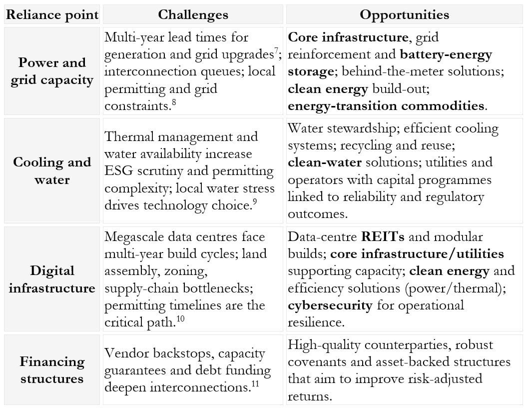 Several points of reliance in the AI buildout map directly to investable themes, creating avenues for contracted, long‑duration cash flows while highlighting potential execution risks.