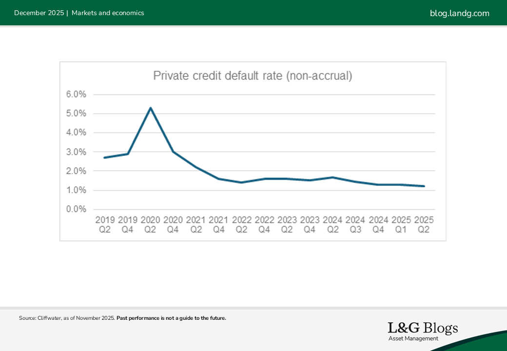 Idiosyncratic cases like First Brands point to emerging cracks but, in our view, there’s no clear evidence pointing to broader stress in sub-IG private credit. Default rates in direct lending remain low and falling interest rates should support debt servicing.