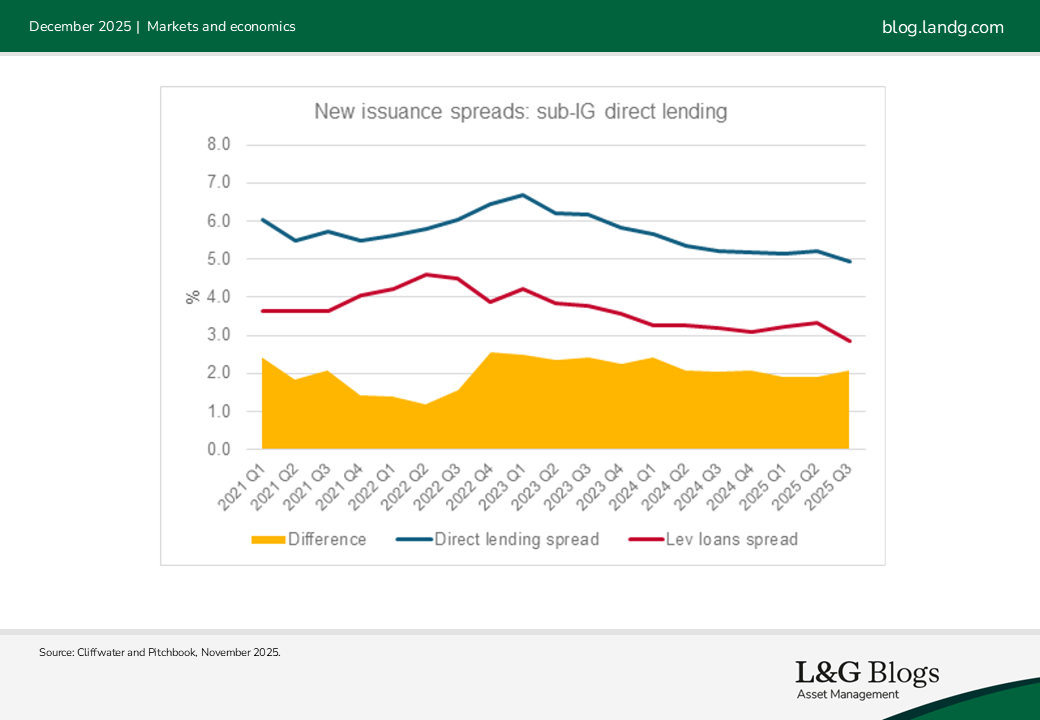 As at end of Q3 2025, sub-IG (direct lending) yield has dipped below its 10-year average. At c.10% it is still attractive relative to most private market asset classes, but the floating-rate yield will soften further with more rate cuts. IG (c.5-6%) screens more strongly on a tactical basis driven by still elevated base rate. It also offers fixed-rate assets enabling investors to lock in current yield. Lower interest rates could be mitigated by spreads widening, driven by either worsening macroeconomic conditions or an increase in supply from lower rates and AI capex.