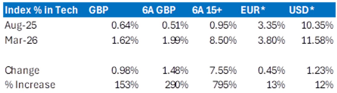 While credit concentration remains modest compared with equities, periods of heavy issuance from large technology firms mean they increasingly shape marginal supply and index dynamics. As credit indices become more tech heavy and more responsive to broad risk sentiment, this brings into focus whether traditional market cap benchmarks still deliver the diversification investors intend, or whether alternative approaches such as equal‑weighted exposures deserve greater consideration.